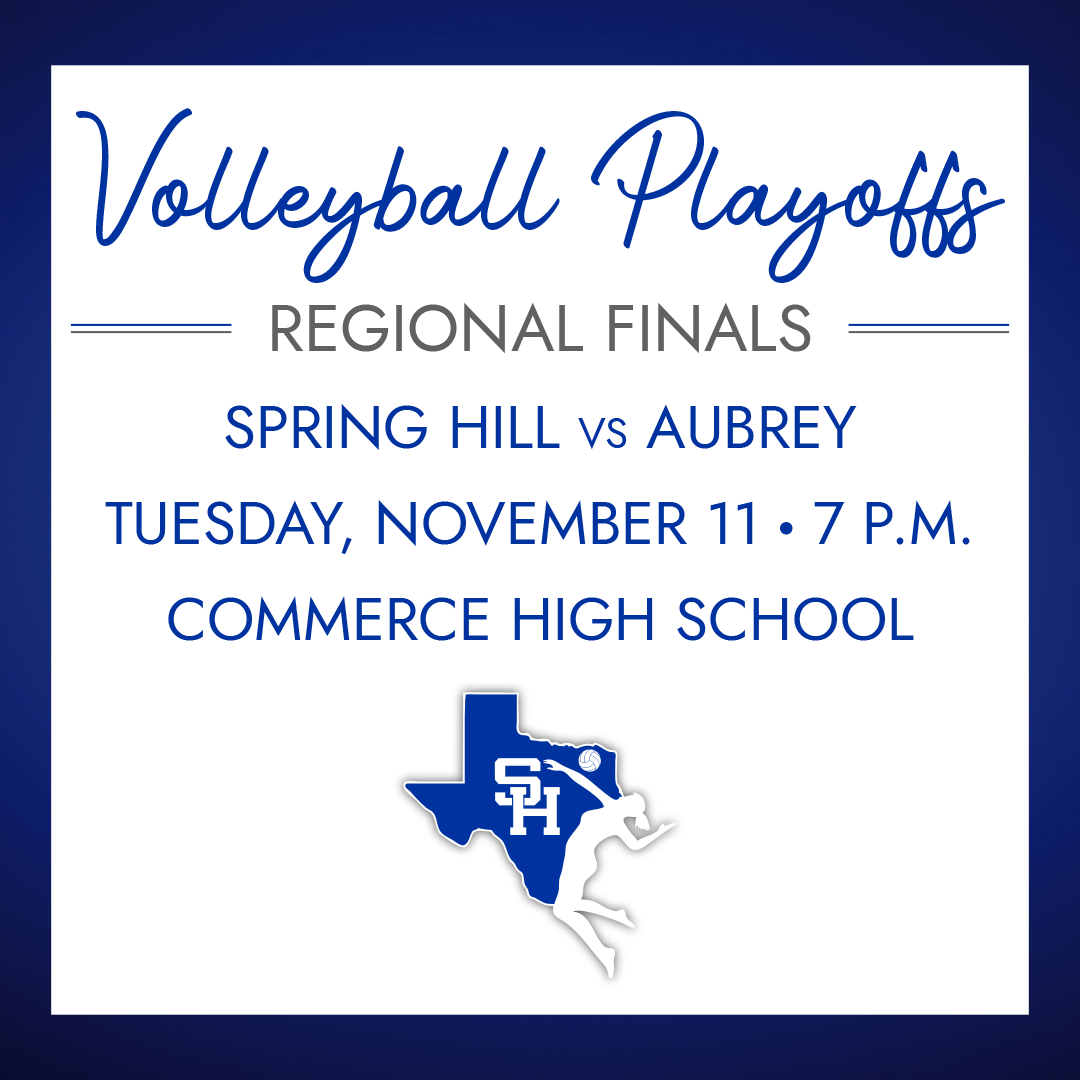 Volleyball Playoffs - Regional Finals VOLLEYBALL REGIONAL FINALS! Spring Hill vs Aubrey Tuesday, November 11 7 p.m. Commerce High School