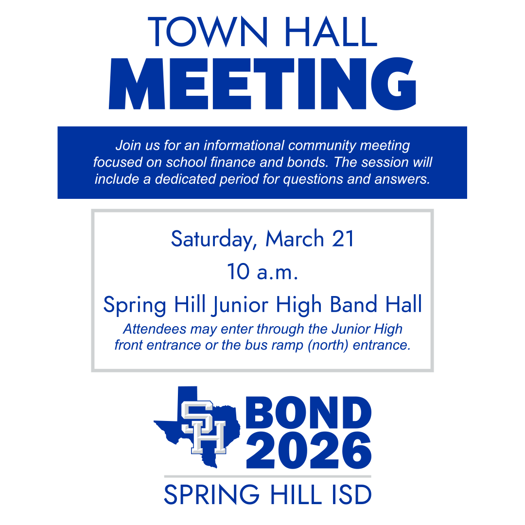 Make plans to attend the Town Hall Meeting on Saturday, March 21, at 10 a.m., at the Spring Hill Junior High Band Hall!