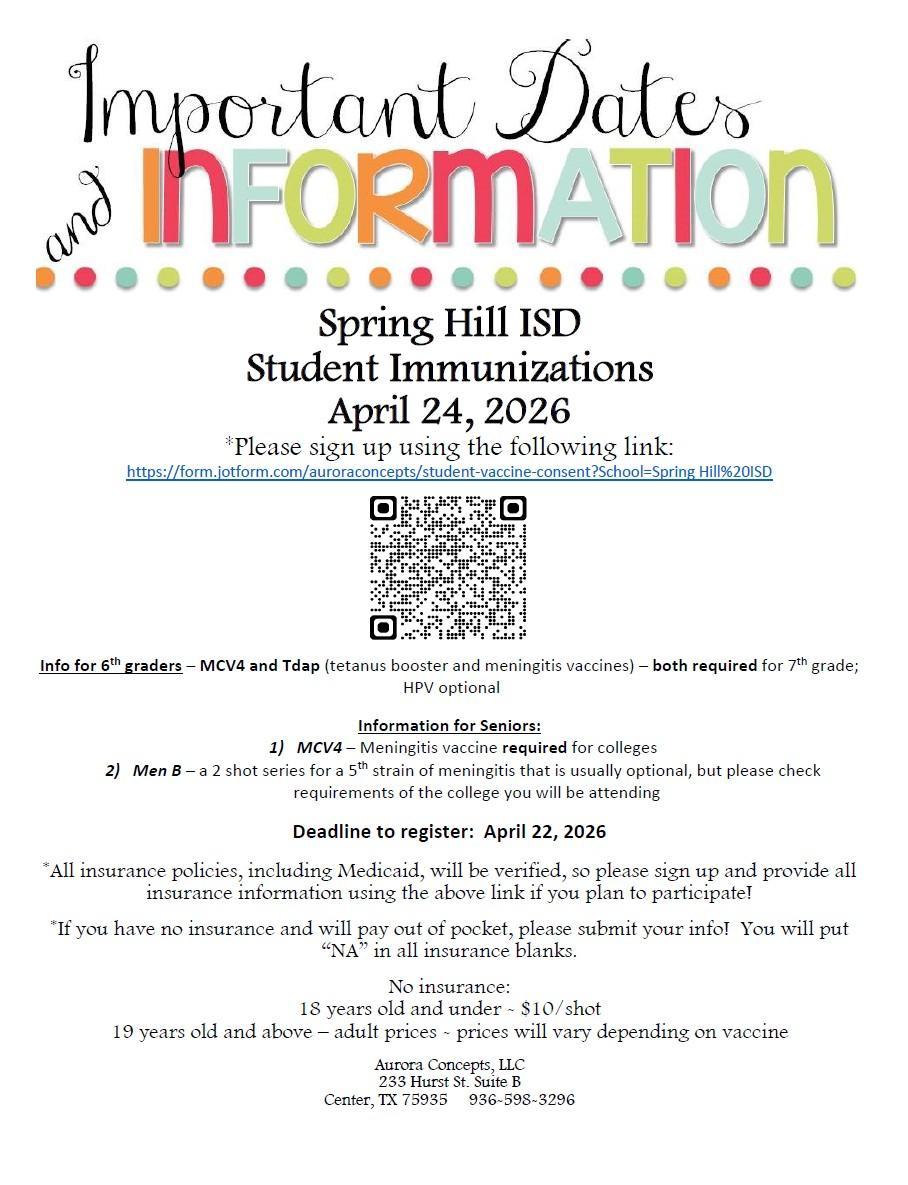 Aurora Concepts will be onsite offering immunizations that students may need on Friday, April 24, from 8 to 9 a.m. at the Junior High and 9 to 10 a.m. at the High School.